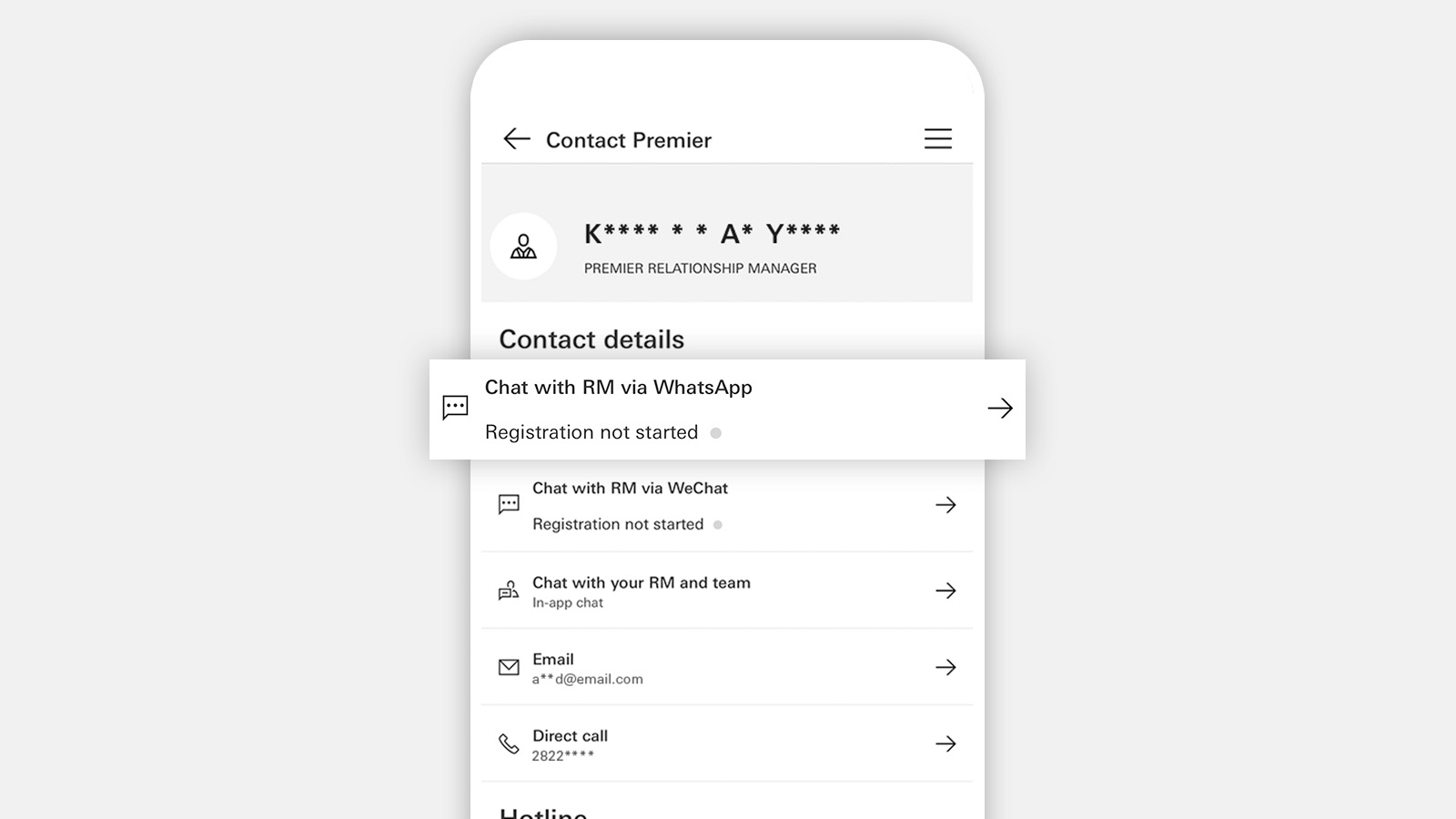 Log on to the HSBC HK App. Select the menu icon, then find 'Contact HSBC Premier Elite' / 'Contact Premier'. Next, choose 'Chat with RM via WhatsApp'.