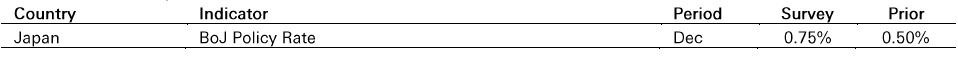 The Bank of Japan (BoJ) is expected to raise its policy rate by 25bp to 0.75% amid recent growth-inflation data. The market focus will likely be on how the BoJ communicates the pace of rate hikes ahead and the terminal rate level.