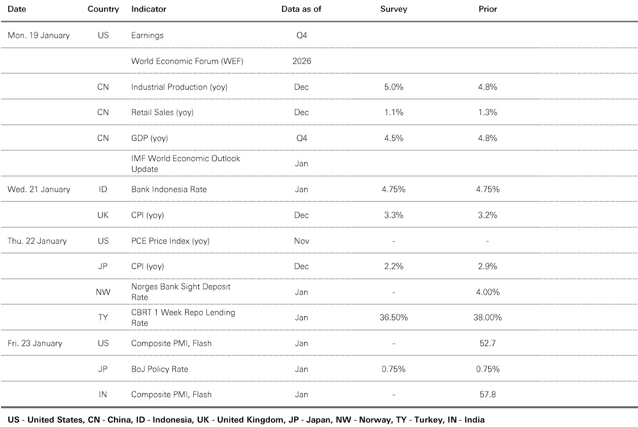 Market sentiment stayed largely positive amid the kick-off of the Q4 2025 US earnings season. The US dollar index rose modestly, while lingering geopolitical risks drove gold prices higher, and oil prices remained volatile. 10-year US Treasury yields were range-bound, whereas rising fiscal worries weighed on JGBs amid mounting expectations of an early election in Japan. The trend of “broadening out” continues in global stock markets: US equities traded mixed, with the small-cap Russell 2000 outperforming the S&P 500 and the tech-dominated Nasdaq. The Euro Stoxx 50 index reached a fresh high, while a weaker yen boosted Japan’s Nikkei 225. Elsewhere in Asian markets, the tech-driven Korean Kospi remained a star performer. Hang Seng also advanced, alongside mild gains in India’s Sensex, whereas Shanghai Composite pulled back from recent rallies.