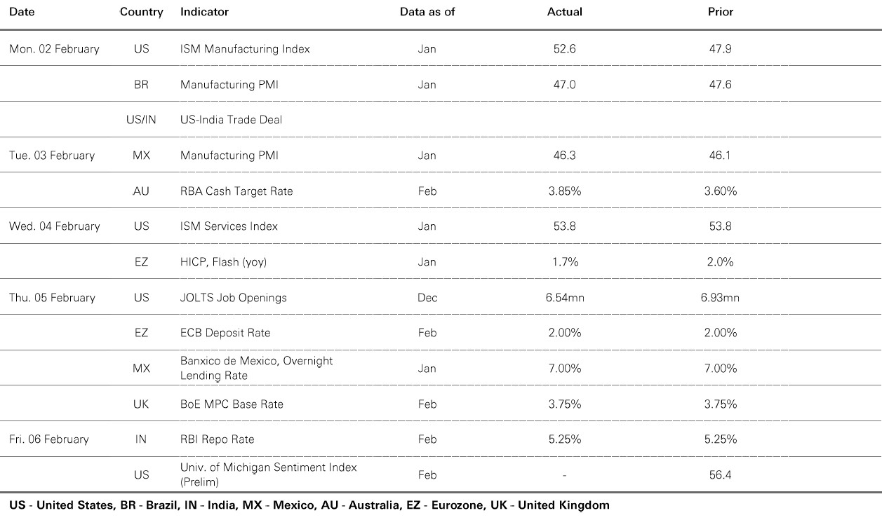 The value of investments and any income from them can go down as well as up and investors may not get back the amount originally invested. Past performance does not predict future returns. The level of yield is not guaranteed and may rise or fall in the future. For informational purposes only and should not be construed as a recommendation to invest in the specific country, product, strategy, sector, or security. Diversification does not ensure a profit or protect against loss. Any views expressed were held at the time of preparation and are subject to change without notice. Any forecast, projection or target where provided is indicative only and is not guaranteed in any way. Source: HSBC Asset Management, Bloomberg, Macrobond. Data as at 7.30am UK time 06 February 2026.