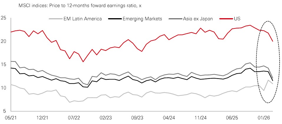 Second, that story is even more pronounced in emerging markets. The oil shock has meant outflows and weaker equity performance but, even so, EMs have held up much better this time than in prior risk-off phases, like 2022. At the same time, profits growth remains spectacular in South Korea and Taiwan, supported by the AI memory supercycle (80% profits growth expected in South Korea in 2026, see Page 2). As a result, the overall EM multiple has compressed to 11x.