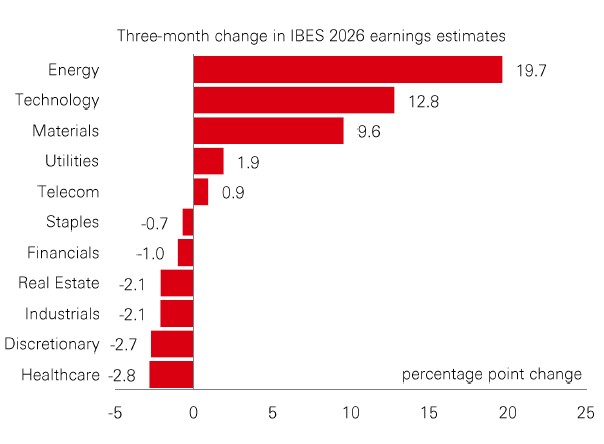 Q1 earnings season comes at a pivotal time amid the Middle East conflict and a strong rally in the S&P 500. The early signs are positive – but there are reasons for caution. There have been some strong profit upgrades in the S&P since the start of 2026. Consensus year-on-year estimates stand at 13% for Q1, and around 20% for the full year. Energy leads the way in the upgrades race this quarter, with profits set to rise sharply. Technology and Communications have also seen strong upgrades on AI enthusiasm. They are jointly set to contribute 64% of total index profits this year. But there are catches. Greater concentration of profits in Tech and Comms could be an increasing risk if questions persist over capex spending and the eventual productivity gains from AI. Meanwhile, recent data imply that consumer spending could be close to flat in Q1, not helped by a soft labour market. Add to that higher oil prices and higher-for-longer rates driven by inflation fears, and it could hurt profits in cyclical and consumer-facing sectors. |