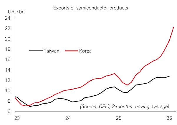 When it comes to roaring stock market returns, South Korea and Taiwan – Asia’s technology powerhouses – have been hard to beat over the past 12 months. That’s down to their pivotal role in the global AI supply chain. But there have been headwinds from the ongoing Middle East conflict. Both countries are energy importers, making them vulnerable to supply disruptions and higher oil prices. Imports of key goods via the Strait of Hormuz have also been impacted, including helium, which plays a critical role in semiconductor manufacturing. |