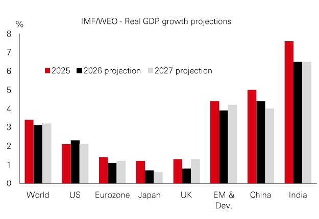Earlier this year, economists at the IMF were confident that the AI boom and policy support had the potential to spur global growth this year. Three months on, their new World Economic Outlook takes a different tone. Middle East conflict, higher energy prices, and inflation uncertainty have forced a moderation of those early 2026 growth forecasts – with some big downgrades. At the headline level, projected global growth is now pencilled in at 3.1% in 2026 and 3.2% next year – slightly down from 2025’s 3.4%. Advanced economies are holding up better overall – although the UK’s growth was snipped sharply for 2026. US growth for this year was also pared back slightly, but it still looks set to outpace 2025 on supportive fiscal policy and the lagged impact of rate cuts. Countries closer to the conflict, and emerging and developing economies – especially commodity importers – face some of the larger downgrades. |