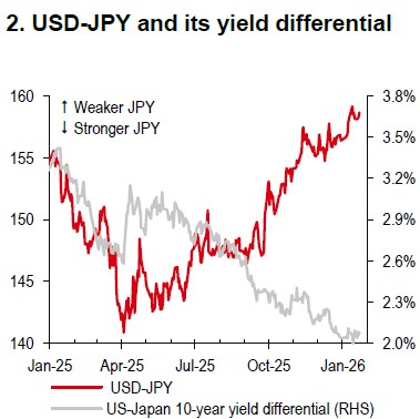 The JPY has kicked off 2026 on a weak note (Chart 1), with attention on the snap election set for 8 February (Bloomberg, 19 January). Political uncertainty in Japan has pushed USD-JPY away from the usual yield differential trends (Chart 2), signalling a growing risk premium for the JPY. With market nerves unlikely to settle over the near term, JPY weakness looks set to persist. However, Japan’s Ministry of Finance may intervene if USD-JPY rises further.