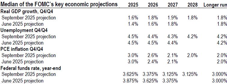 As widely expected, the Federal Reserve (Fed) resumed its policy easing, cutting the federal funds target range by 25bp to 4.00-4.25% at the 16-17 September meeting – the first rate cut this year. The decision was voted 11 to 1, with the lone dissent coming from Fed Governor Stephen Mira in favour of a 50bp reduction. The updated Federal Open Market Committee’s (FOMC) economic projections were small but mostly hawkish, with higher growth and inflation, and lower unemployment (see the table below for details). The median interest rate projections (known as “median dots”) for 2025, 2026, and 2027 are lower than those laid out at the June meeting by 25bp. It suggests two further 25bp cuts in 2025, followed by one additional cut in 2026, more hawkish than market pricing of at least four further 25bp cuts by end-2026 (Bloomberg, 18 September 2025).