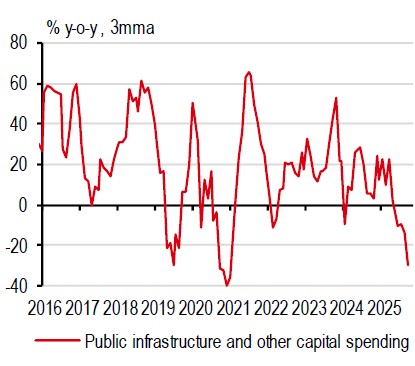 But the main culprit was government spending. When the ambitious Build-Build-Build programme started in 2016, government infrastructure investments became a driving force for growth. However, due to controversies over flood-control projects, public capital disbursements have been falling by more than 20% y-o-y since July – pulling growth down by as much as 1.3ppt.