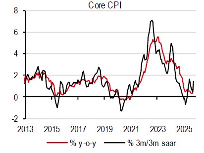 In addition, inflation has finally picked up. After being subdued at 0.5% on average in the first nine months of 2025, core inflation rose 1.2% y-o-y in October, though in part due to base effects. We expect core inflation to grow beyond 1% y-o-y from 4Q25. Overall, we recently revised upward our core inflation forecast slightly to 0.7% (from 0.6%) for 2025 and to 1.3% (from 0.9%) for 2026. While a low-inflation environment opens the door for the Monetary Authority of Singapore (MAS) to ease again, we expect the MAS to stay put through our forecast horizon. The MAS’ primary focus is no doubt growth, but fiscal policy should take the lead in prompting growth if headwinds materialise.