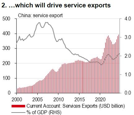 China’s exports have shown unexpected resilience, with the goods trade surplus climbing to a record high of USD1.2trn in 2025, driven by competitive pricing, strong performance, and reliability. However, Chinese manufacturers are increasingly pursuing overseas direct investment (ODI) to optimise supply chains and manage trade uncertainties. This trend is in its early stages. While outbound direct investment may partially substitute goods exports, it is likely to boost service exports.
