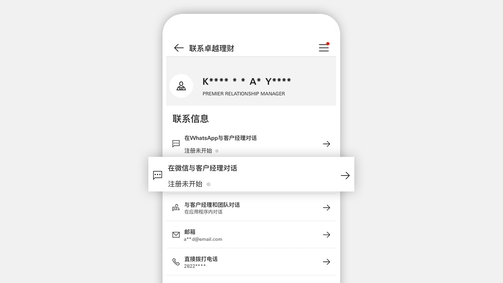登录HSBC HK App,并点选菜单图标。选择“联系汇丰卓越理财尊尚”或”联系卓越理财”,再选择”在微信与客户经理对话”。
