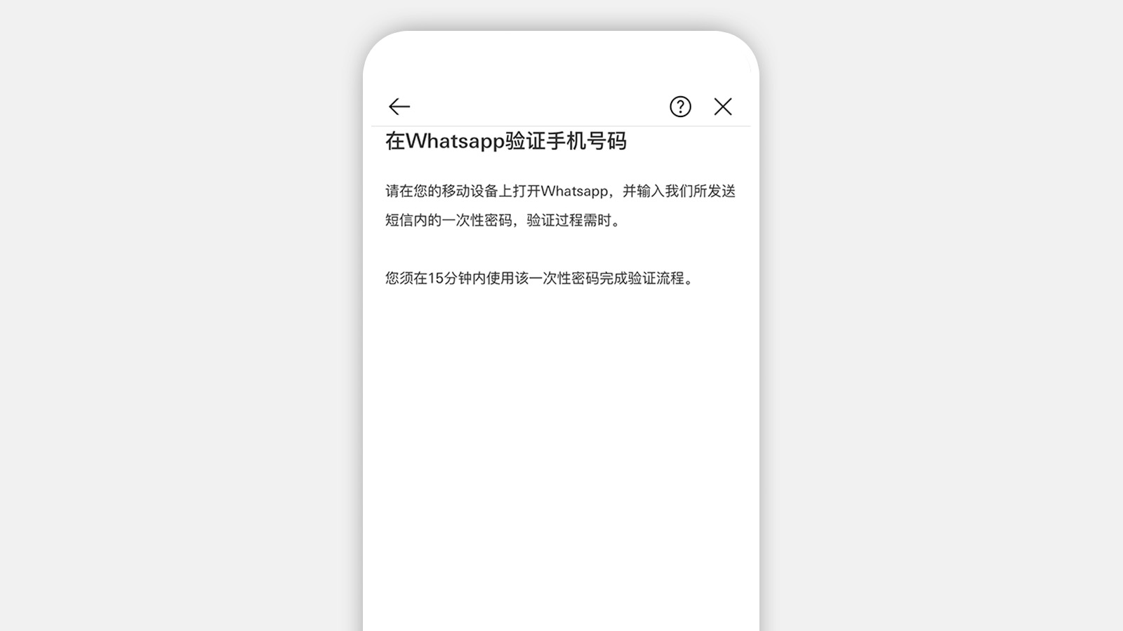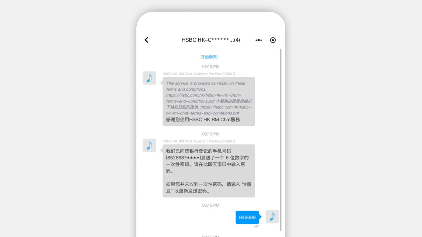 我们将会以短信向您发送一组6位数字的一次性密码。请在15分钟内输入一次性密码,以完成身分验证程序。验证成功后,即可开始与客户经理和团队对话。