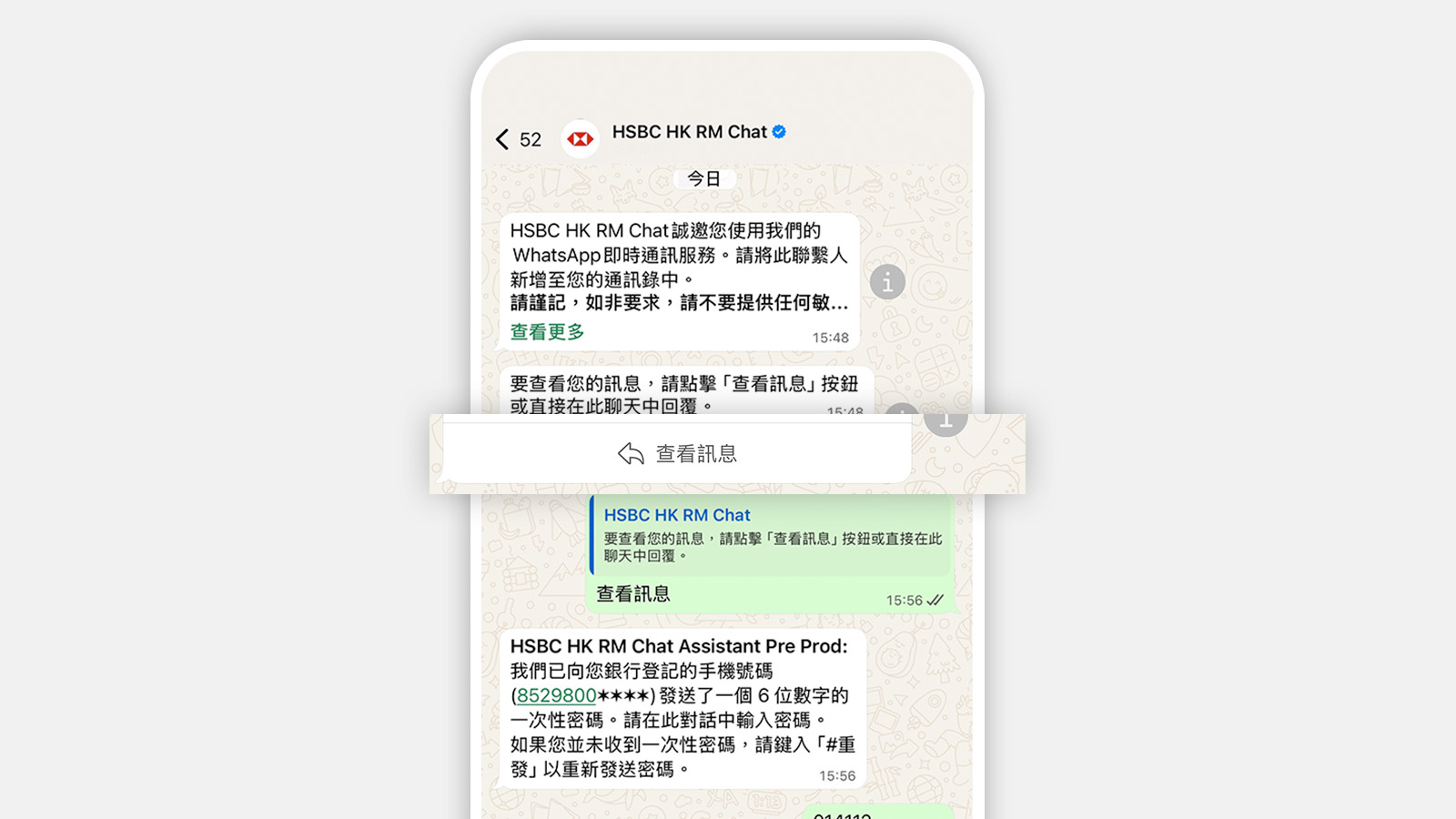 核对个人联系连系资料,然后选择”在WhatsApp验证号码”。开启WhatsApp,您会收到来自汇丰香港RM Chat的邀请。