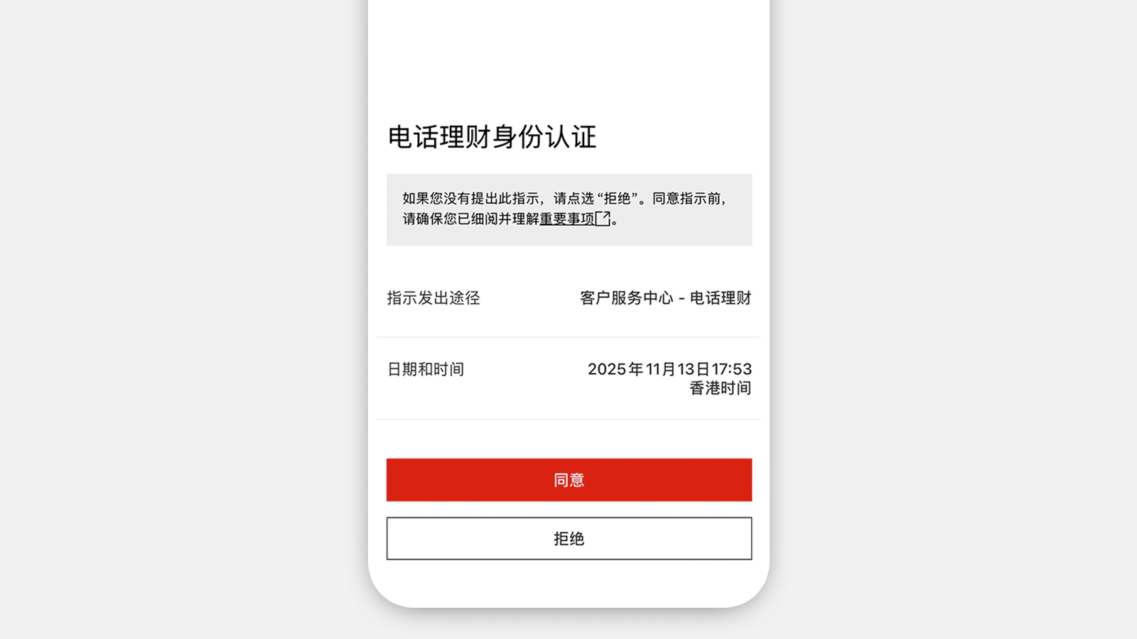 完成认证后客户服务主任将继续处理你的服务指示[@wtb-in-app-auth-request]。如果您没有发出电话理财或“线上对话”认证请求,请拒绝有关指示,请选择“举报可疑活动”并立即与我们联系。