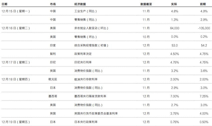 过往表现并非未来回报指标。息率水平不获保证,日后可升或可跌。仅供参考,不应视为投资特定国家、产品、策略、行业或证券的建议。多元化并不能确保盈利或防止亏损。所表达的任何观点均截至编制为止,如有更改,恕不另行通知。指数回报假设所有分派再投资,不反映费用或开支。您不能直接投资于指数。所提供的任何预测、预计或目标仅供参考,概非任何形式保证。成本可能因汇率波动而变化。资料来源:汇丰投资管理。Macrobond及彭博。数据截至2025年12月19日(英国时间上午7时30分)。