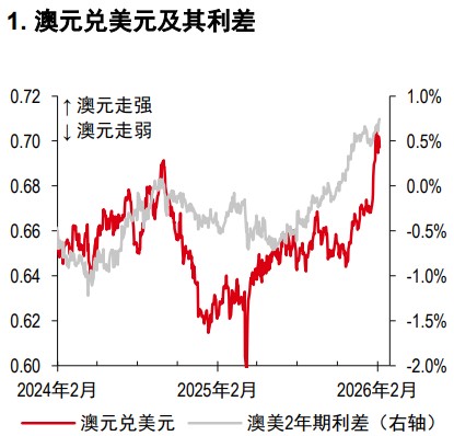 澳元近期的涨势略显过度,年初以来对美元已上涨约 3.5%(彭博资讯,2 月 6 日)。因此,澳元兑美元未来数周可能进入盘整阶段,原因在于短期走势或将更多由外部因素驱动,而非利差变化(图 1)。