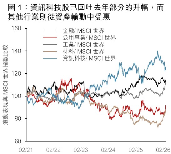 • 投資者擔心傳統軟件企業或被人工智能初創公司取代,導致市場近日出現拋售。然而,我們認為這些擔憂被誇大了,因為這些企業同樣可善用人工智能提升營運效率。資金由資訊科技輪動至其他行業,令投資機遇擴展至工業、材料及公用事業板塊。我們的多元資產配置方案有助分散於不同資產類別、行業、地區及貨幣市場。