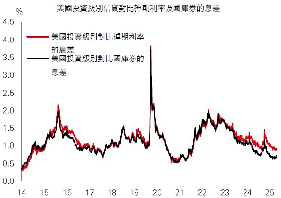 首先,美國和其他成熟經濟體的政府債券息率一直高企,反映赤字擴大和政府債務增加所導致的財政風險溢價上升。對比之下,高級別企業則持續去槓桿、延長債務年期及建立現金緩衝。因此,整體信貸息差可能因為政府債券年期溢價過高而顯得較低。
