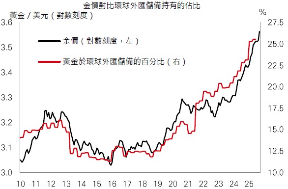 今年金價升幅驚人。年初至今已上升約55%,預期將成為2025年表現最佳的資產類別之一。此輪升勢源於全球央行進一步加快持有黃金,目前全球約四分之一的儲備以黃金形式持有。這主要與地緣政治有關,各國增加黃金儲備,尋求在與美國政府關係緊張時,降低在動用儲備時出現問題的風險。