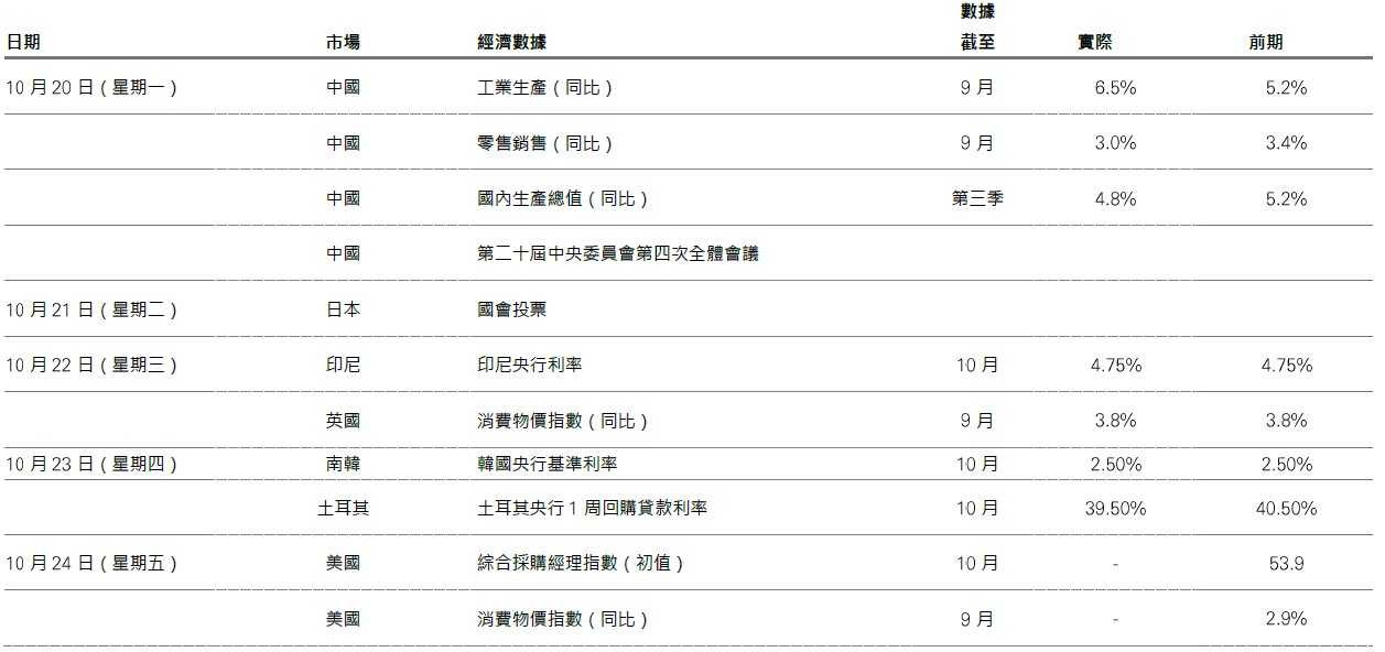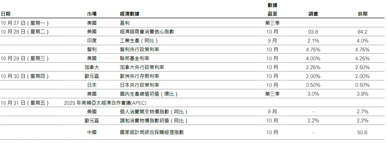 風險市場普遍向好,受聯儲局本周進一步放寬政策的預期提振。美元指數轉強,美國國庫券在美國消費物價指數(在美國政府停擺期間少有的數據公布)公布前夕窄幅波動。英國政府債券表現領先,通脹回落的跡像日增。美國和歐元區信貸息差保持穩定。股市方面,美股上揚,投資者消化第三季盈利普遍樂觀;道瓊斯歐洲50指數亦上揚。日本日經225指數上升,受日圓轉弱支持,市場亦憧憬新首相高市早苗將推行財政寬鬆。其他亞洲市場在APEC會議召開前夕表現良好:南韓Kospi指數急升至歷史新高,印度Sensex指數亦延續近期升勢。恒生指數收復過去的部分跌幅。商品方面,地緣政治憂慮提振油價,金價回落。