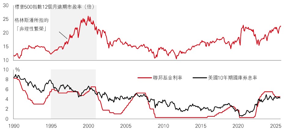 但相似之處僅限於此嗎?兩者的起步點亦值得留意。1995年初,標普500指數的12個月遠期市盈率僅略高於12倍,對比現時則接近22倍。此外,1990年代末宏觀環境較為有利,通脹和失業率下降,而且全球化步伐急促。債券息率結構性地向下,推動了股票估值重估。對比之下,現時環球經濟碎片化,使通脹難以回落,供給側容易受到衝擊。各國政府的財政日見緊絀,債券息率可能維持在高位,預期宏觀經濟波動將會持續。