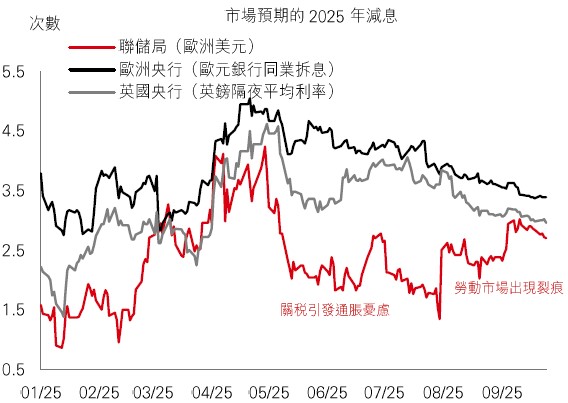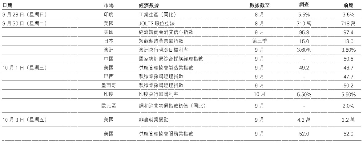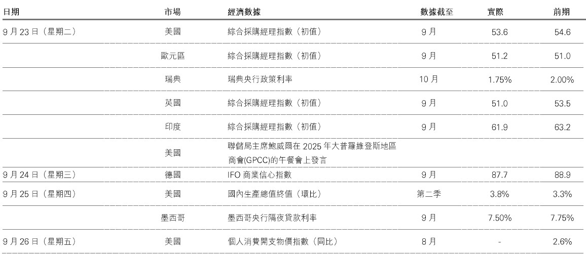 過往表現並非未來回報指標。息率水平不獲保證,日後可升或可跌。僅供參考,不應視為投資特定國家、產品、策略、行業或證券的建議。多元化並不能確保盈利或防止虧損。所表達的任何觀點均截至編製為止,如有更改,恕不另行通知。指數回報假設所有分派再投資,不反映費用或開支。您不能直接投資於指數。所提供的任何預測、預計或目標僅供參考,概非任何形式保證。資料來源:滙豐投資管理。Macrobond及彭博。數據截至2025年9月26日(英國時間上午7時30分)。