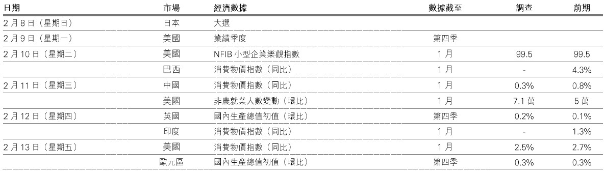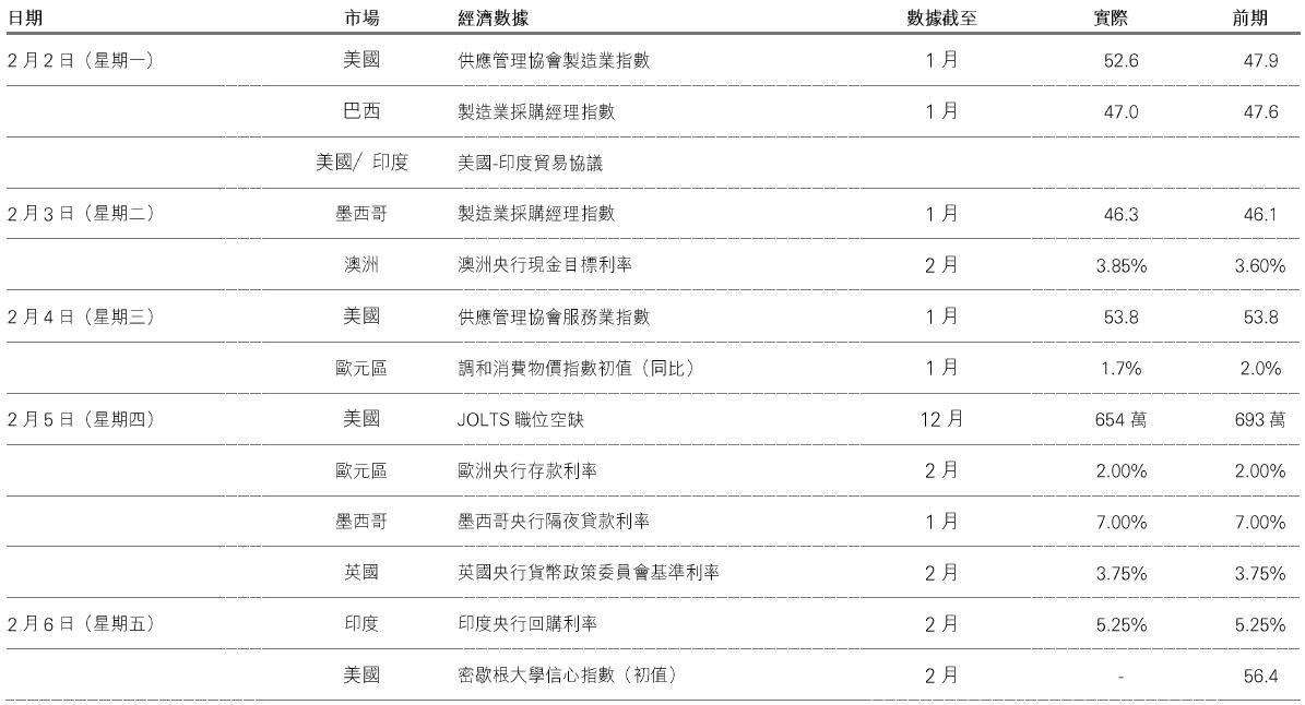 過往表現並非未來回報指標。息率水平不獲保證,日後可升或可跌。僅供參考,不應視為投資特定國家、產品、策略、行業或證券的建議。多元化並不能確保盈利或防止虧損。所表達的任何觀點均截至編製為止,如有更改,恕不另行通知。指數回報假設所有分派再投資,不反映費用或開支。您不能直接投資於指數。所提供的任何預測、預計或目標僅供參考,概非任何形式保證。成本可能因匯率波動而變化。資料來源:滙豐投資管理。Macrobond及彭博。數據截至2026年2月6日(英國時間上午7時30分)。