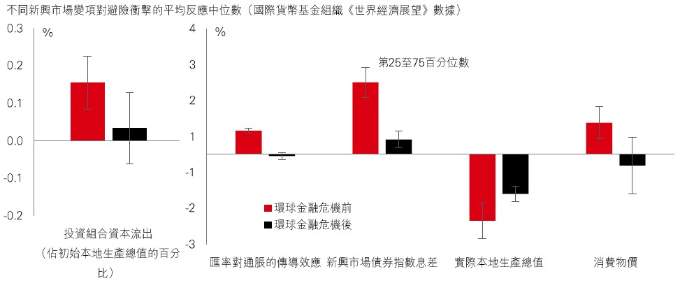 上圖正好說明這一點。與環球金融危機前相比,現時新興市場經濟體的抗壓能力明顯提升。資金外流不算嚴重,貨幣走弱傳導至通脹的程度較低,整體增長所受衝擊亦普遍較小。換言之,新興市場不再是脆弱的順周期板塊,而更像是一組由更強大、亦更具可信度的政策框架所支撐的經濟體。