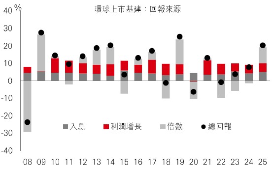這主要有三大原因。首先,基建股票是一些重要長遠市場主題的支柱,例如人工智能超級周期和電力需求。其次,基建股票受到投資者青睞,因近期投資者由昂貴的美國科技業,輪動至更可預測的資產密集型行業(如公用事業和能源)。第三,基建向來是市場內偏向防守性的板塊,對周期行業波動的敏感度較低。因此,在充滿不確定性和波幅的環境下,對比其他市場領域(包括債券和黃金等傳統避險資產),基建股票的可靠現金流和股息或許更具吸引力。