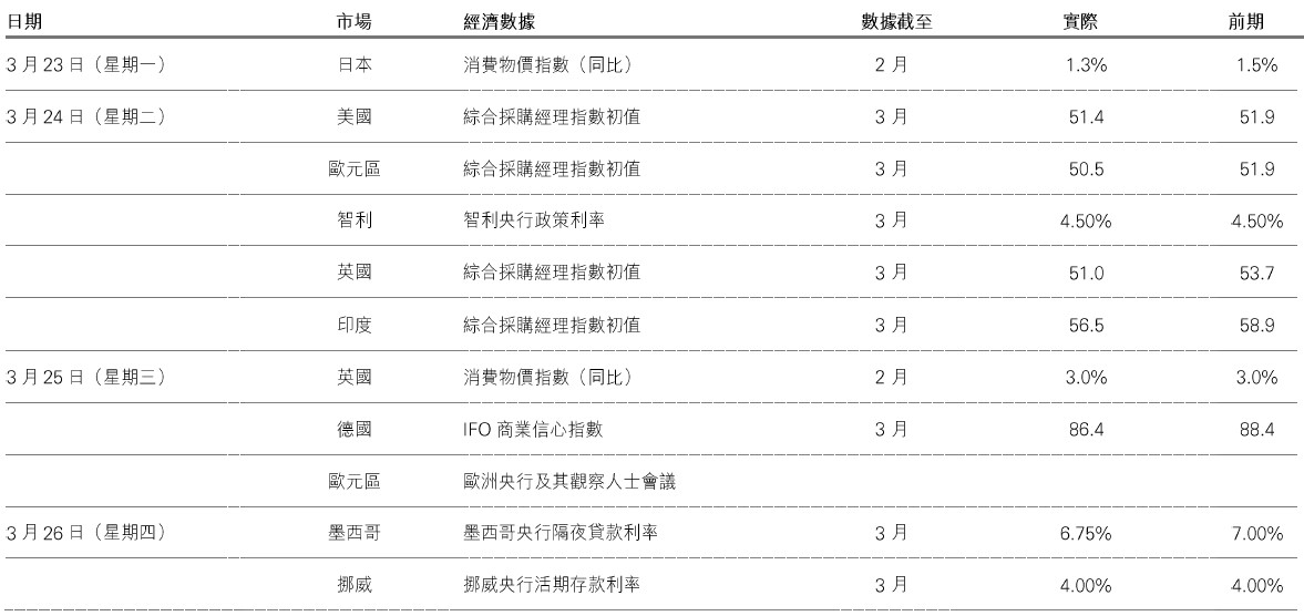 過往表現並非未來回報指標。息率水平不獲保證,日後可升或可跌。僅供參考,不應視為投資特定國家、產品、策略、行業或證券的建議。多元化並不能確保盈利或防止虧損。所表達的任何觀點均截至編製為止,如有更改,恕不另行通知。指數回報假設所有分派再投資,不反映費用或開支。您不能直接投資於指數。所提供的任何預測、預計或目標僅供參考,概非任何形式保證。資料來源:滙豐投資管理、Macrobond及彭博。數據截至2026年3月27日(英國時間上午7時30分)。