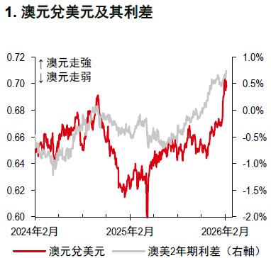 澳元近期的升勢略顯過度,年初以來對美元已上升約3.5%(彭博資訊,2 月6 日)。因此,澳元兌美元未來數星期可能進入盤整階段,原因在於短期走勢或將更多由外圍因素驅動,而非利差變化(圖1)。
