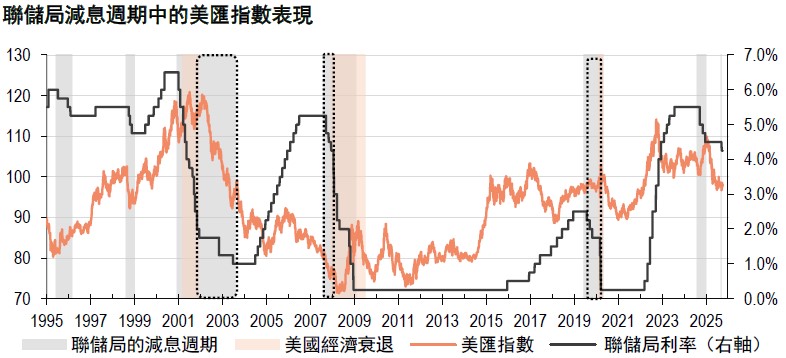 市場正在爭論美元是否已經觸底,並準備開啟上升趨勢。我們認為美元在明年年初觸底之前,仍有逐步下跌的空間,特別是考慮到美國聯邦儲備局(簡稱「聯儲局」或「美聯準」)可能減息。歷史經驗表明,在聯儲局減息,但美國經濟並未陷入衰退的時期(例如2002 至2003 年、2007 年下半年和2019 年下半年),美元通常會走弱,這一規律為分析當前情況提供了參考。此外,美國貿易政策的不確定性和聯儲局的獨立性也可能令美元承受下行壓力。