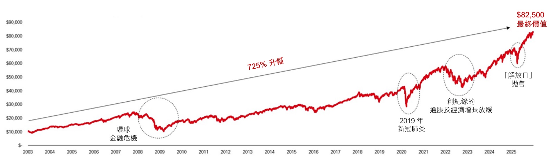 短期波動是投資過程不可或缺的一部分 市場會跟隨消息或估值及企業盈利預期而波動。投資者需要記住,金融市場不時波動本是意料中事。 短期波動可能隨時發生,但未必會阻礙股市的長期增長。根據以往紀錄,市場會於嚴重挫折(包括經濟低迷及地緣政治事件)之後大幅回升。 熱點新聞雖然會影響短期市場氣氛,並導致資產估值降低,但長遠來看,股價最終應是基本因素決定。因此,投資者應避免在波動期間恐慌性拋售,以免錯過潛在的市場回升。 |
