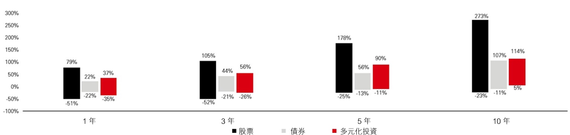 分散投資意味着同時投資於不同的資產類別,從而使投資不易受到大幅波動的衝擊。不同資產類別往往在不同市況下表現各異。