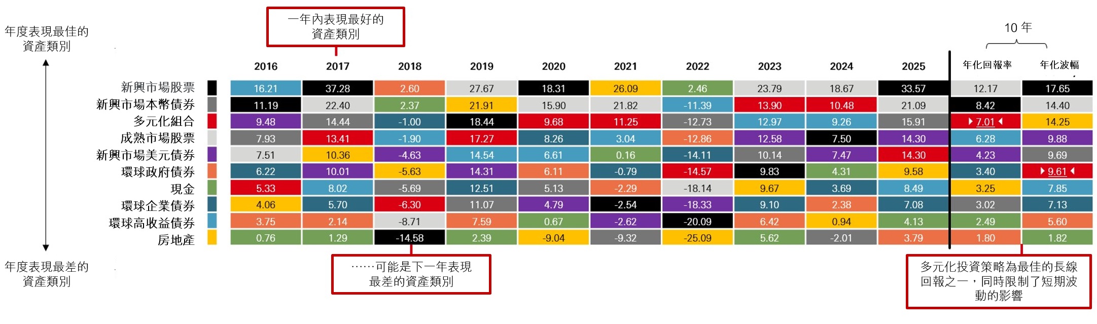 資料來源:晨星、滙豐投資管理,數據截至 2025 年 12 月。所有回報為美元計總回報。參考指數:摩根士丹利世界指數 (成熟股票市場);摩根士丹利新興市場股票指數 (新興市場股票);摩根大通政府債券指數—新興市場環球多元化指數 (新興市場本幣債券);洲際交易所美銀美林新興市場債券指數 (新興市場本幣債券);彭博巴克萊全球整合企業債券指數 (環球企業債券);洲際交易所美銀美林環球高收益債券指數 (環球高收益債券) ;富時世界國債指數 (環球政府債券) ;富時EPPRA /NAREIT上市房地產指數 (房地產) ;現金:三個月擔保隔夜融資利率;多元化表現以所有參考指數的平均值計算 (多元化組合) 。債券指數已經對沖。股票未經對沖。過往表現並不代表未來回報。