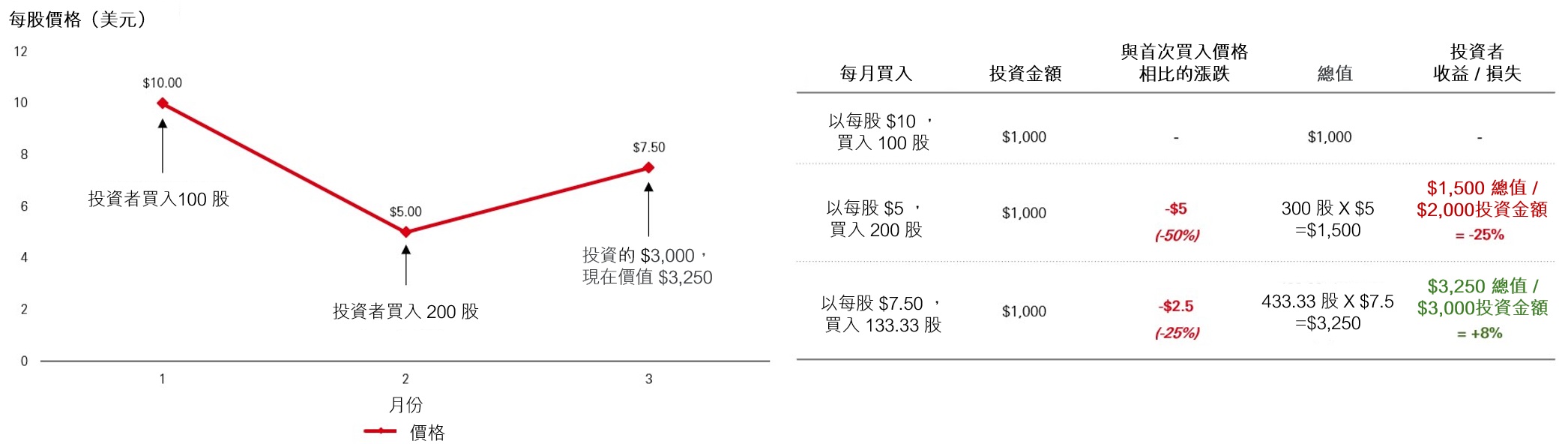 即使投資者以每股$10和$5的價格購買價值$1,000的股票,結果仍會是盈利。這是因為定期投資固定金額意味着在$5的較低價格下購買的股票數量是原本在$10價格時購買數量的兩倍。