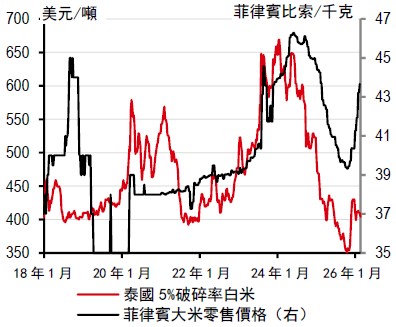在連續10 個月低於目標區間後,整體通脹率終於在2 月回到了菲律賓央行2%-4%的目標區間內。然而,隨著大米零售價格自12 月以來上漲約10%,通脹前景再度轉弱。大米是消費價格指數籃子中最重要的組成部分,如果這種價格上漲趨勢持續下去,可能會推動通脹上升0.9 個百分點。