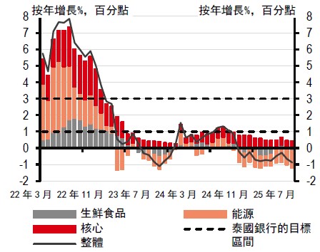 鑒於多重因素交織影響,我們最近將2026 年增長預測調整至1.6%(原為1.7%)。此外,泰國對石油的依賴也使其通脹前景對全球油價變化較為敏感,因此我們亦將2026 年通脹預測上調至1.2%(原為0.6%)。