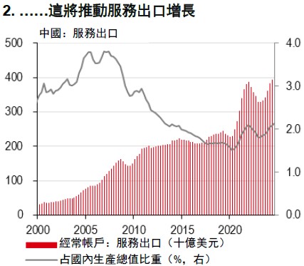 中國出口的韌性超出預期。2025 年,受價格競爭力、強大性能和可靠性支撐,貨物貿易順差攀升至創紀錄的1.2 萬億美元。不過,中國製造企業正日益透過對外直接投資來優化供應鏈、應對貿易不確定性。這一趨勢仍處於早期階段。儘管對外直接投資可能在一定程度上替代貨物出口,但更有可能推動服務出口增長。