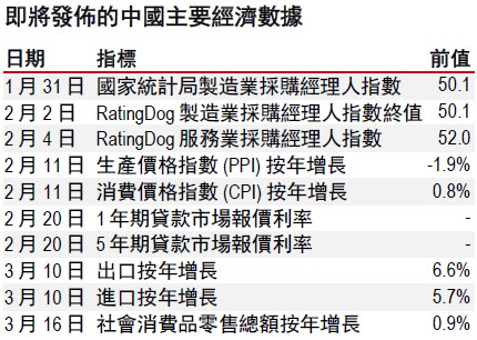 • 消費價格指數在12 月按年上漲0.8%,核心消費價格指數保持穩定(按年上漲1.2%),其中食品價格有所上漲(按年上漲1.1%),尤其是蔬菜價格(按年上漲18.2%)。在生產端,生產價格指數按年降幅收窄至1.9%,這得益於有色金屬製造業價格上漲(按年上漲10.8%),尤其是銅價在12 月創下歷史新高。